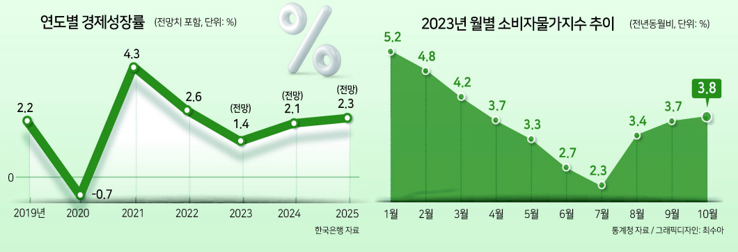 2023년의 소비자 물가상승률은 1월부터 10월까지 다양한 변동을 보였습니다. 작년 말의 급등은 양적 완화 조치로 인한 것이었으나, 최근에는 금리 인상 등으로 물가가 안정화되고 있습니다. 2023년 10월에는 +3.8%로 상승했지만, 이는 일부 변동이 있을 수 있음에 유의해야 합니다.