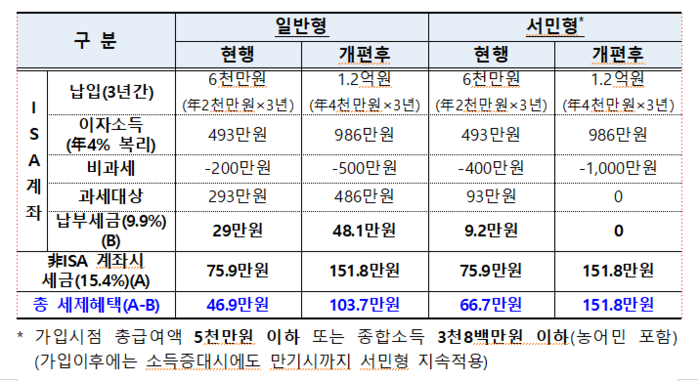 - 정부는 제도 개선을 통해 ISA의 장점을 극대화하고자 합니다. 이에 따라 가입자들이 체감하는 세제 혜택이 기존 대비 최대 2.3배 증가할 전망입니다.