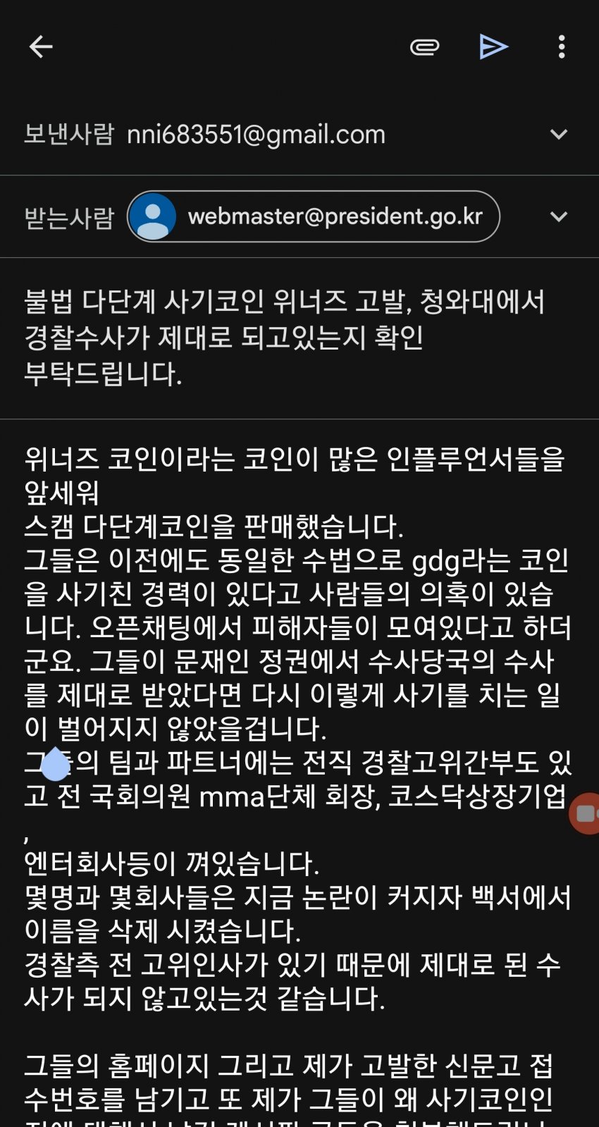 위너즈 코인 사기 관련자들이 이전에 GDG 코인으로 사기친 경력이 있다는 의혹. GDG 코인 홍보에 이천수 선수도 관여한 정황