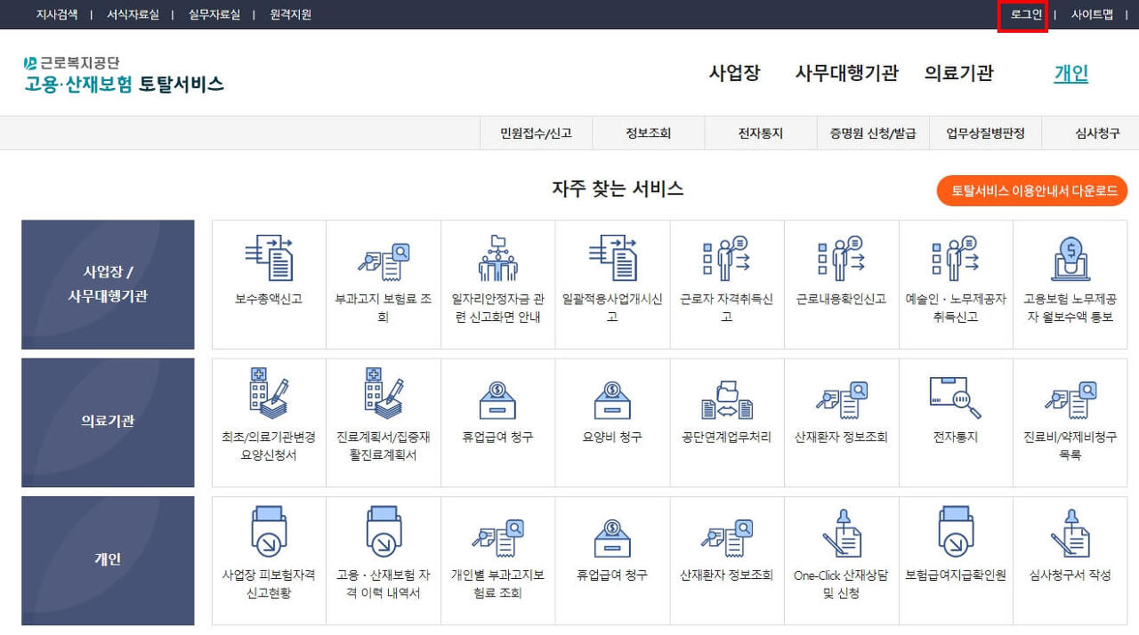 2. 로그인 과정: 홈페이지 우측 상단의 '로그인' 버튼을 클릭합니다. 이후, 근로자의 경우 '개인'을 선택하고, 대부분의 경우 '일반근로자'를 선택합니다.