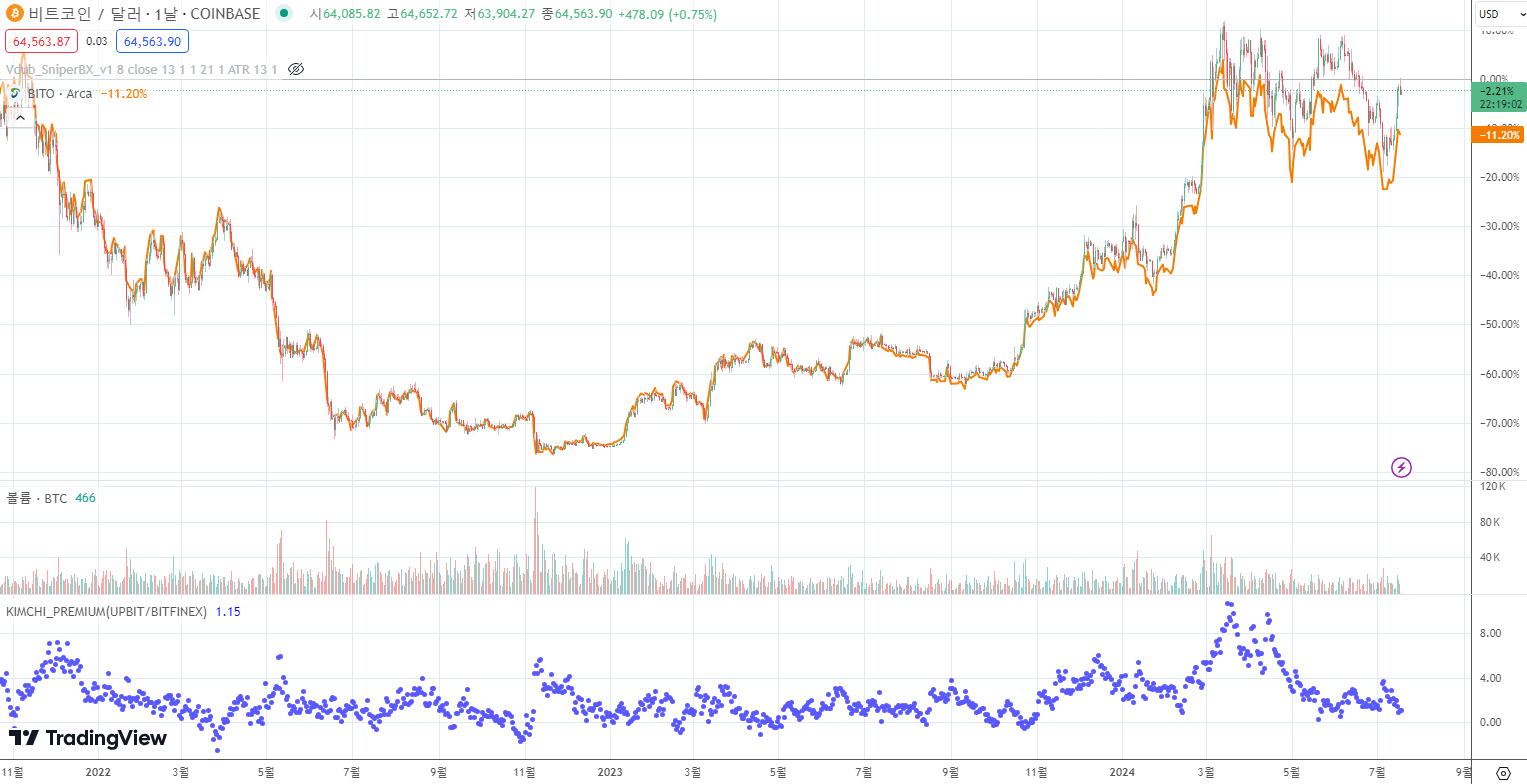 (캔들: coinbase btc 달러가격, 주황색: bito 달러가격)