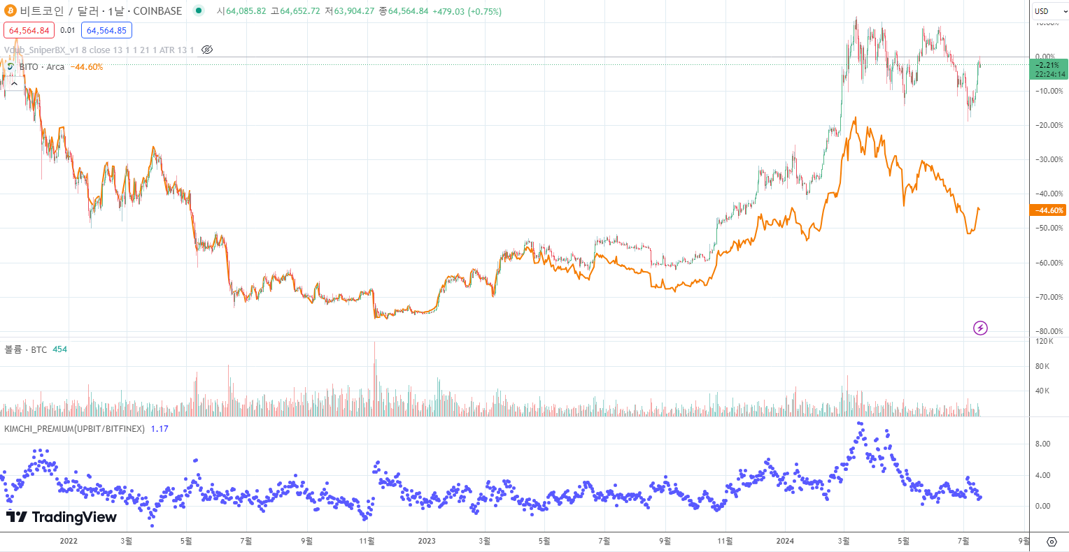 BITO 거래시 수수료, 각종 세금 및 불장 시 김프를 고려하면 현물이 훨씬 유리함을 알수 있음