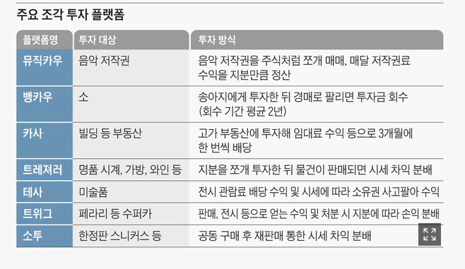 다른 조각투자 업체들도 금융 당국의 결론을 주시하고 있다. 한 미술품 조각투자 업체 관계자는 “자산 투자 방식이 뮤직카우와 달라 문제될 것은 없을 것으로 보고 있지만 금융위 판정을 주목하고 있다”고 했다.