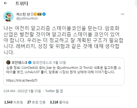 5월 15일 저스틴 썬은 자신은 알고리즘 코인을 믿는다면서 아래와 같이 트윗하였다.