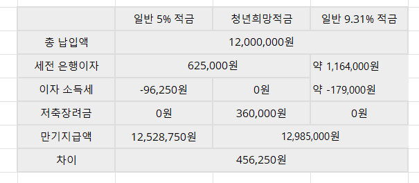 은행마다 우대 금리를 최대 1%p를 더 주기 때문에 개인별로 차이를 가만하더라도,  기본 금리 5%  월 최대 납입액 50만원을 2년동안 납입한다고 가정할 시,  청년희망적금과 다른 적금 상품과의 비교는 아래와 같다.