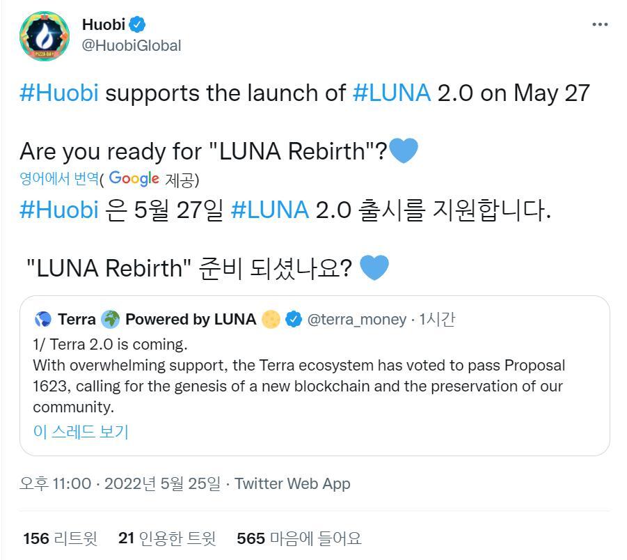 후오비는 테라 생태계 복구를 위해 권도향 테라폼랩스 대표의 제안으로 발행되는 루나 2.0을 상장하겠다는 입장을 나타냈다.