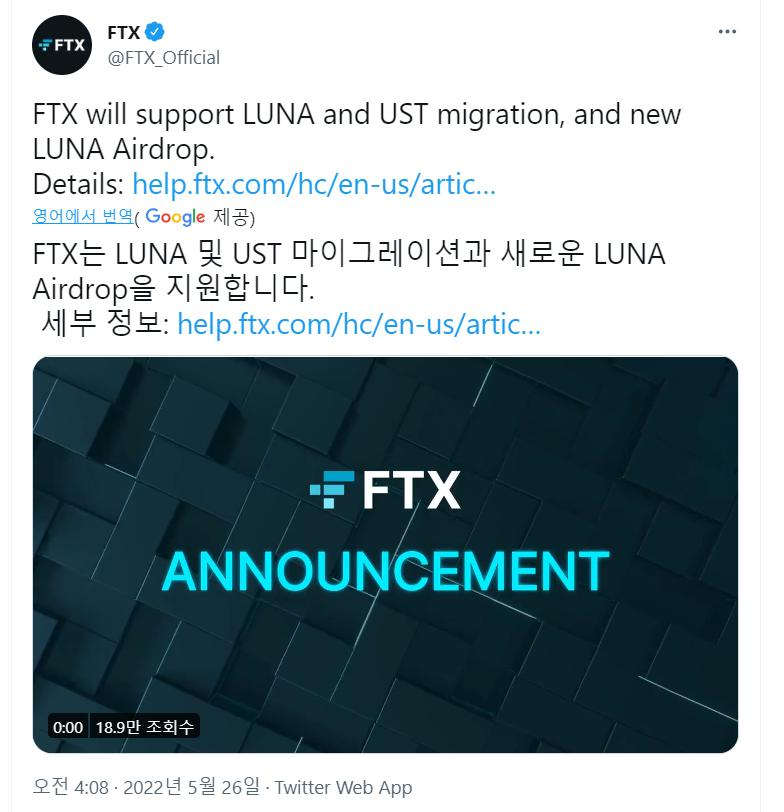 FTX 거래소와 우리나라 업비트도 LUNA 에어드랍을 지원하겠다는 트윗과 공지를 게시하였다.