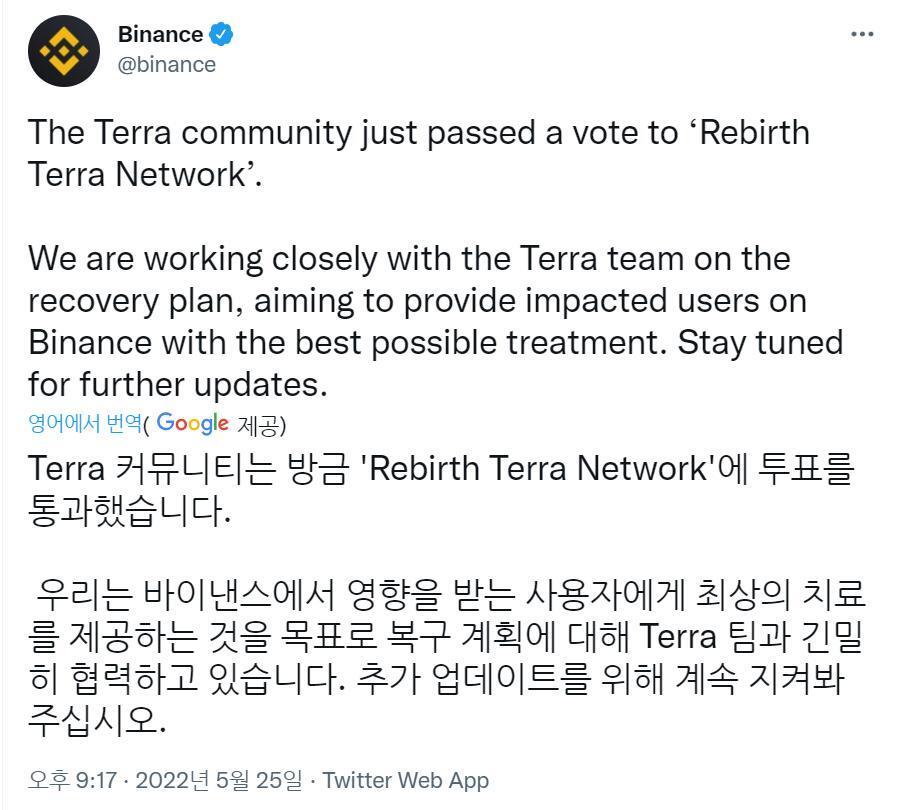 세계 최대 암호화폐 거래소 바이낸스 또한 새로운 루나를 통해 테라 네트워크의 복구를 지원하겠다는 입장을 밝혔다.
