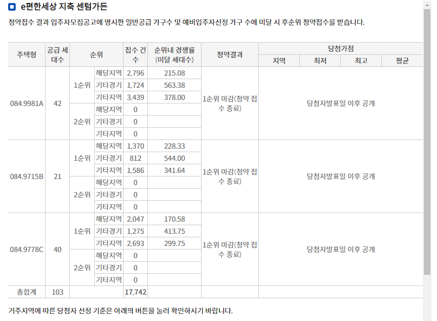총합계 103 공급세대수에 17,742명 신청해서 5.8 대 1000 정도 되네요.
