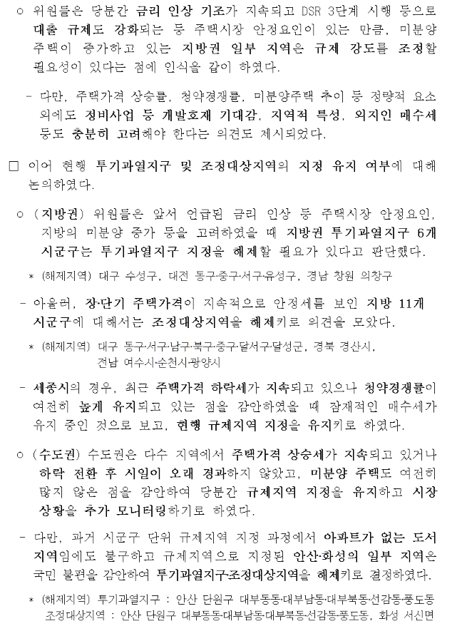 지방 11시군구(대구 동구,서구,남구,북구,중구,달서구,달성군, 경북 경산시, 전남 여수시, 순천시, 광양시) 에 대해 조정대상 지역을 해제 할 예정입니다.