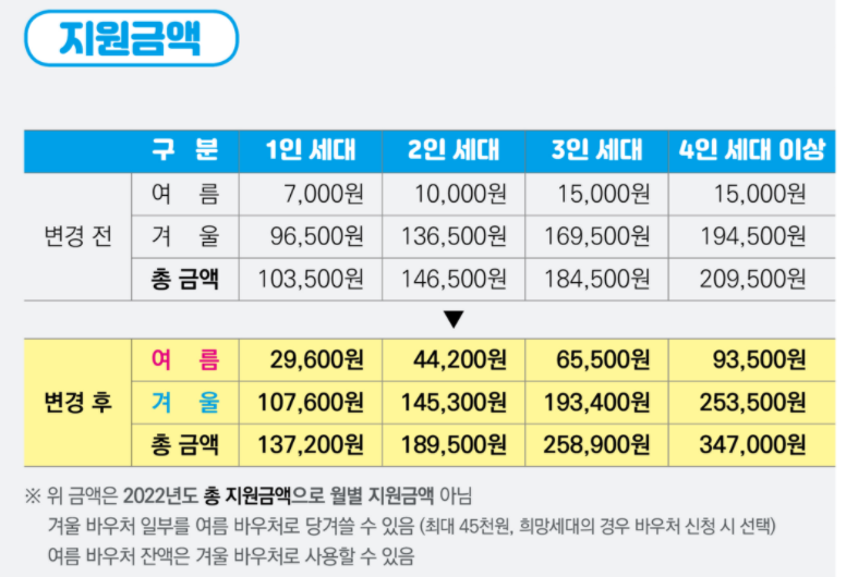 - 겨울 바우처 (2022년 10 월 12일 ~ 2023년 4월 30일) : 요금차감 (전기, 도시가스, 지역난방 중 1개), 국민행복카드 (등유, LPG, 연탄, 전기, 도시가스)