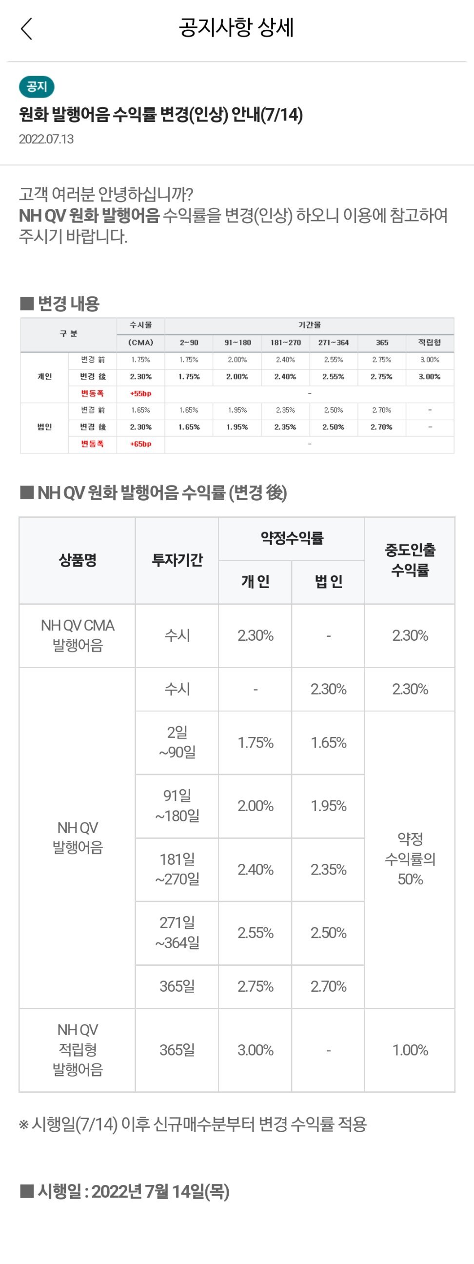 7월 14일부터 NH투자증권 CMA 입출금통장 금리도 2.3% 인상된다는 소식입니다. 토스(2.0%)보다 높습니다.