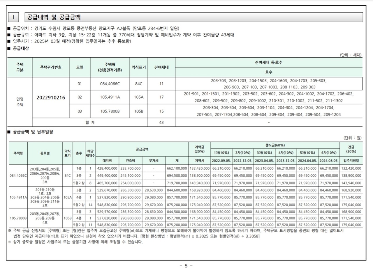: 총 770세대 정당계약 및 예비입주자 계약 이후 잔여물량 43세대