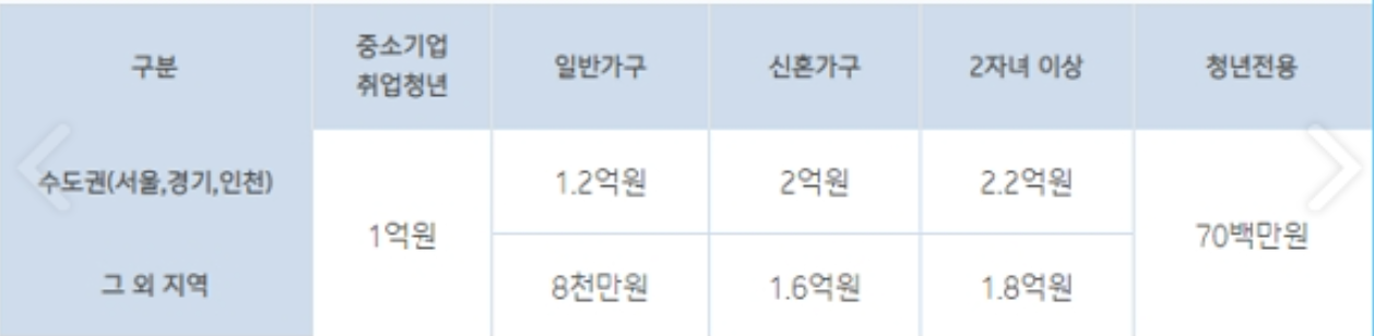- 신혼가구 전용 : 혼인기간이 7년 이내인 신혼가구 또는 3개월 이내 결혼예정자에게 1.2%~2.1% 금리로 최대 2억원까지 지원