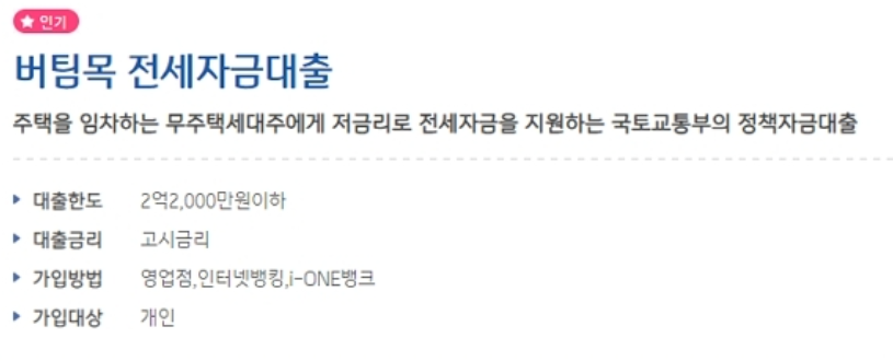 - 중소기업취업청년전용 : 만34세 이하의 중소, 중견기업재직자에게 연 1.2%금리로 최대 1억원까지 지원