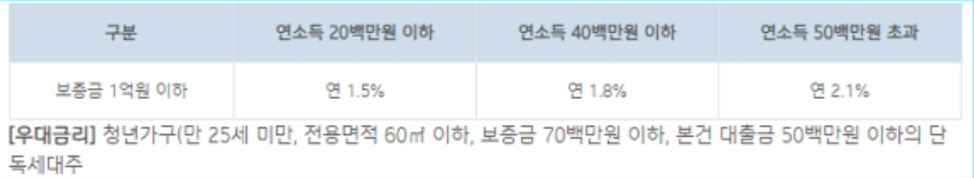 - 청년전용 : 만34세 이하의 세대주에게 1.5%~2.1% 금리로, 최대 70백만원까지 지원