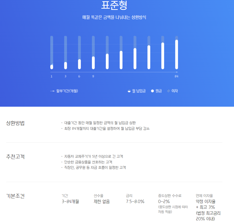 차량을 구매하려는 경우 자동차 구입대금을 자금사정에 따라 최장 84개월까지 대출기간을 설정해주어 월 납입금 부담을 감소시켜주는 금융상품입니다.