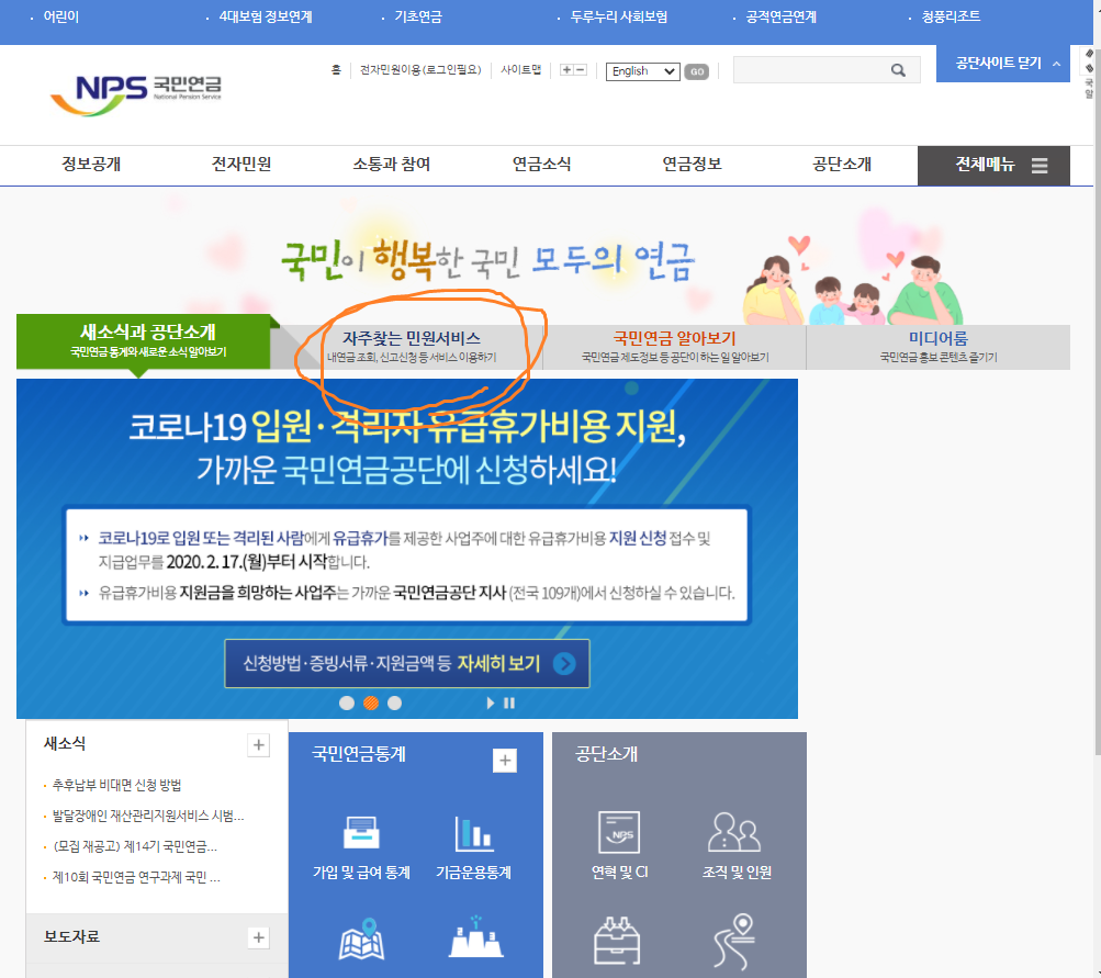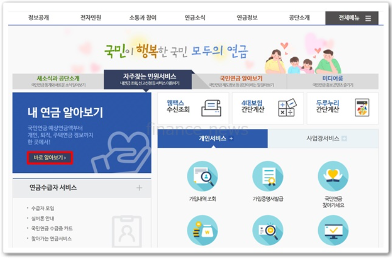 NPS국민연금 홈페이지 접속 ---> 자주찾는 민원서비스 클릭