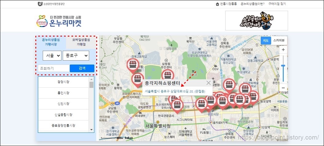 온누리마켓 접속 후 사용할 지역 선택하고 모바일 상품권 가맹점을 선택하면 오프라인에서 모바일 온누리 상품권을 사용할 수 있는 상점을 찾을 수 있습니다.