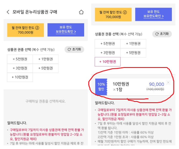 2. 다양한 상품권 권종을 복수로 선택할 수 있으며, 100만원 구매시 10% 할인하여 90만원에 구매할 수 있습니다.