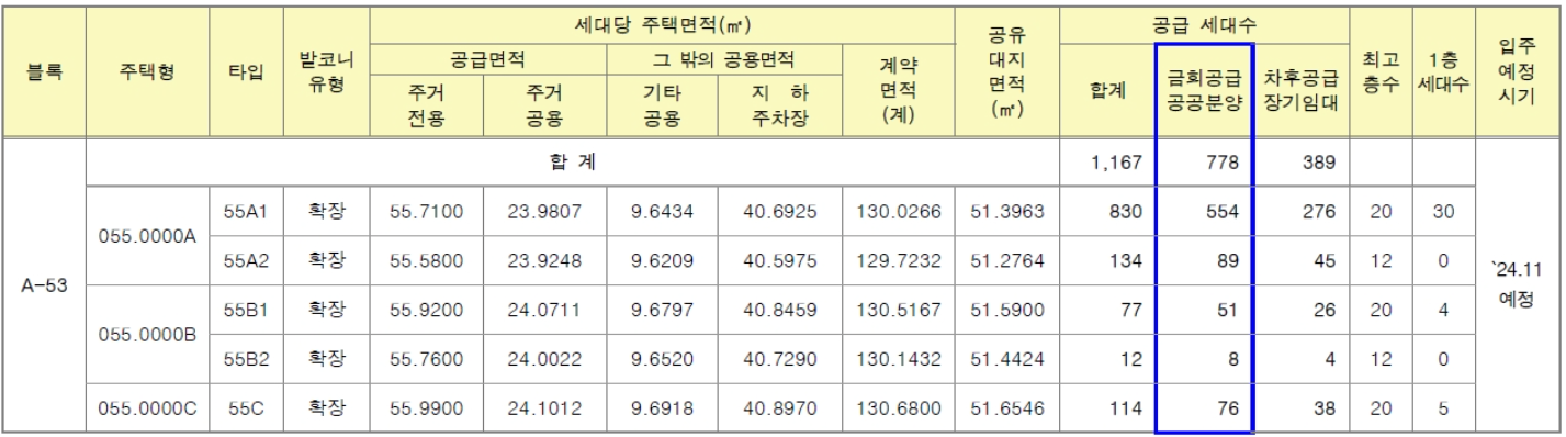 : ▲55A1 554세대 ▲55A2 89세대 ▲55B1 51세대 ▲55B2 8세대 ▲55C 76세대