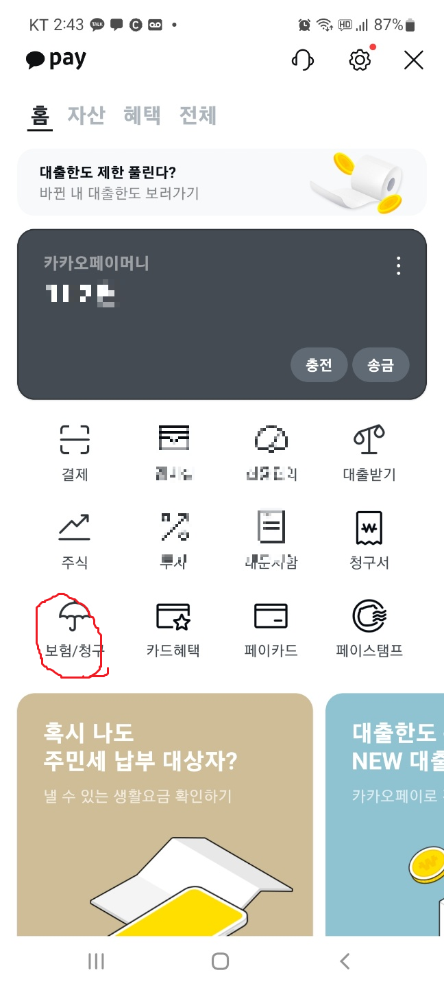 - 카카오 앱에서 우측 하단 ooo 버튼 클릭하여 카카오 페이로 들어간다.