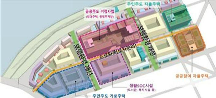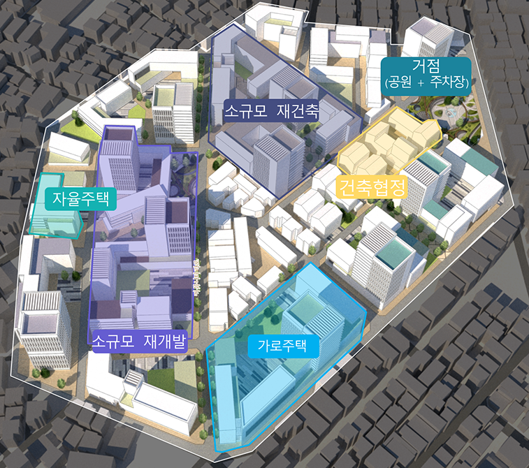 • 면적 10만m² 이내 및 노후도 50% 조건을 만족하면 기존의 노후화된 주거지를 지하주차장과 지상의 녹지조성까지 이룬 대규모 아파트 단지 수준으로 개발 가능