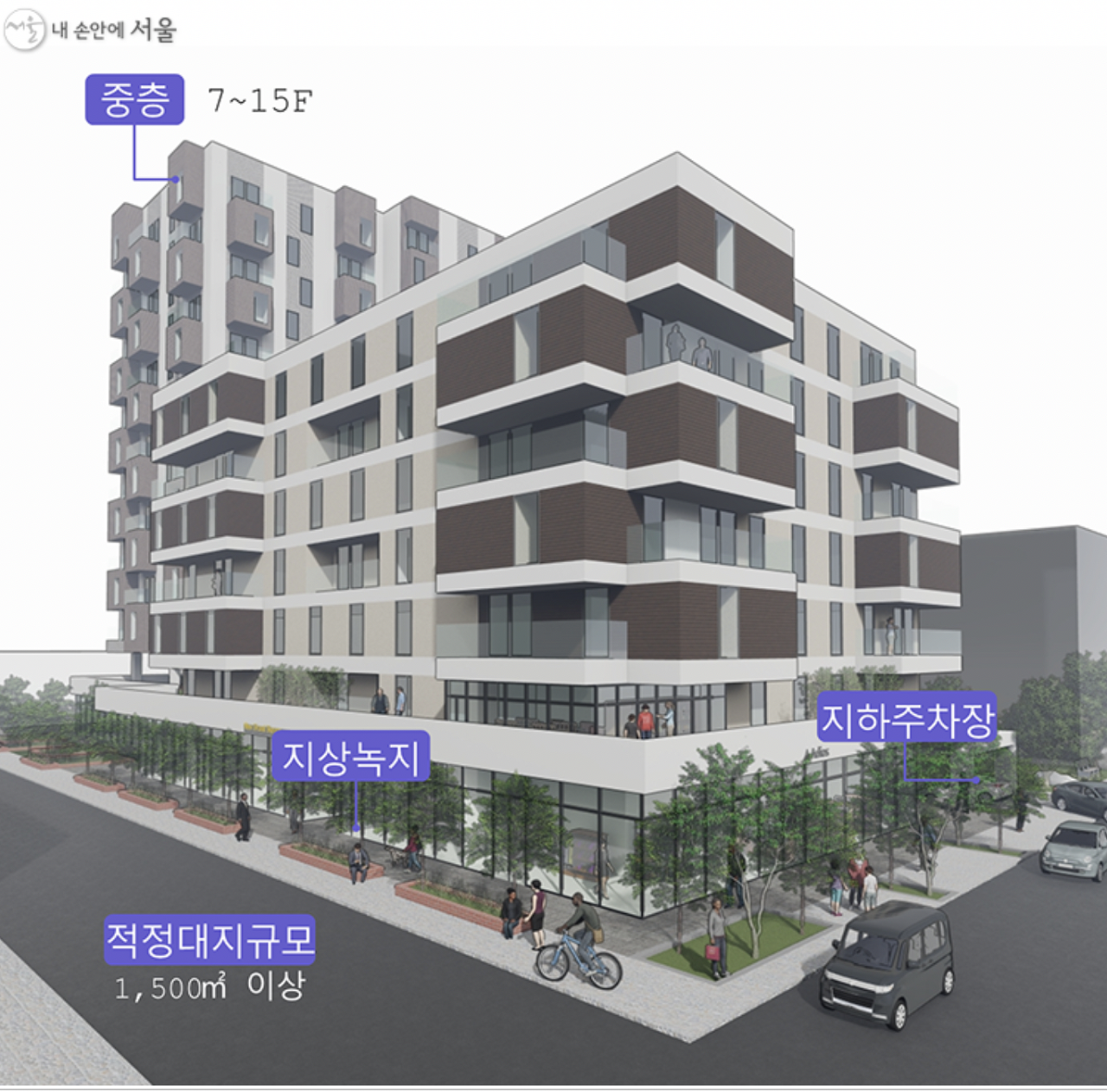 - 최고 층수를 15층까지 허용하고, 필요에 한해 용도 상한 가능