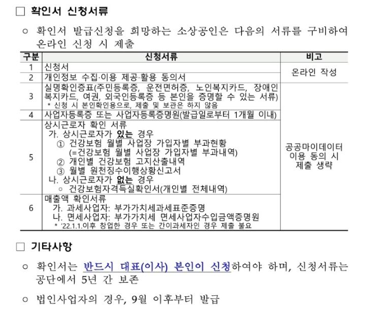 - 법에 따라 등록된 개인사업자와 법인 소상공인, 소기업이어야 할 것