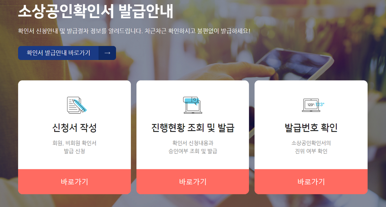 : 온라인 신청(소상공인) --> 접수, 검토 및 발급승인(공단) --> 출력(소상공인)