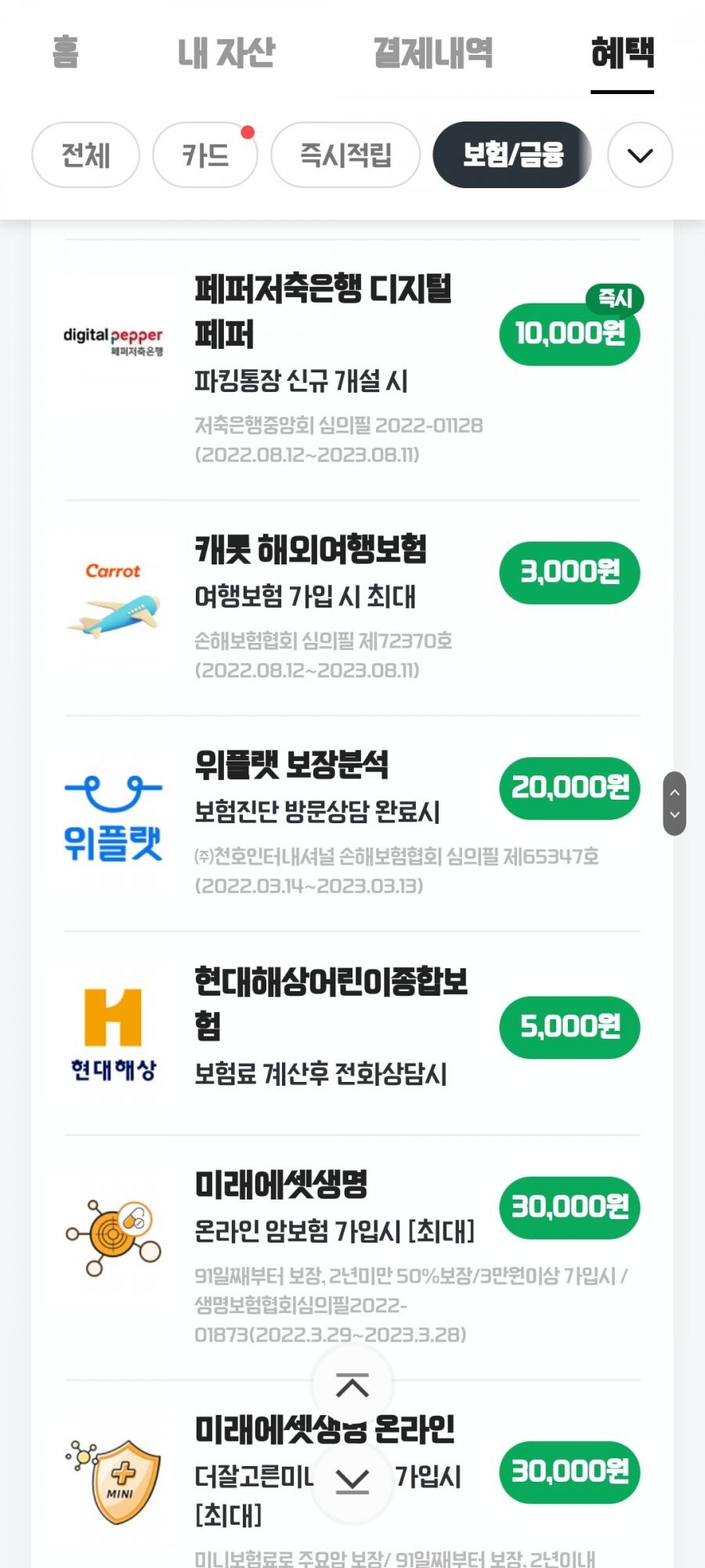 네이버페이 --> 혜택 --> 보험/금융