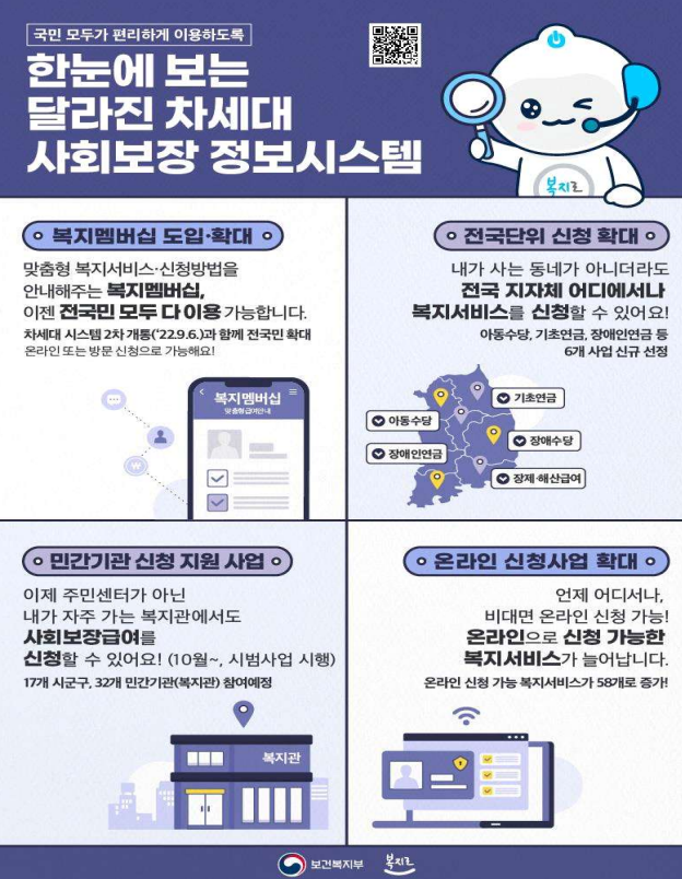 9월 6일 부터 차세대 사회보장정보시스템 2차 개통이 서비스를 들어간다고 보건복지부에서 밝혔습니다. 이를 통해 기존 '맞춤형 급여 안내 전 국민 확대', '전국단위 신청사업 확대' 등 약자를 위한 복지 혜택과 국민 불편이 해소될 수 있을 것이라고 하네요.