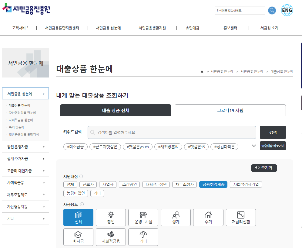 하면 수십개의 금융취약계층을 위한 상품이 검색 가능합니다.