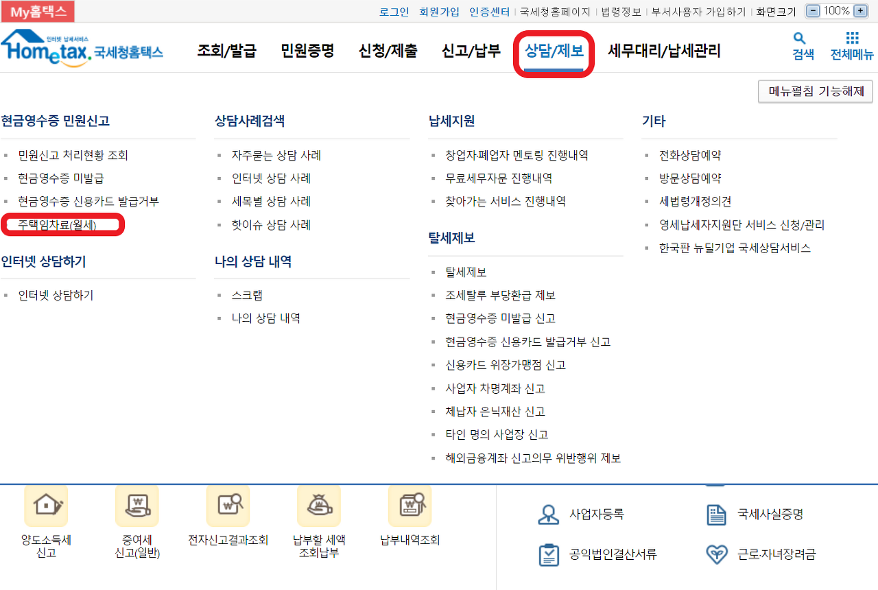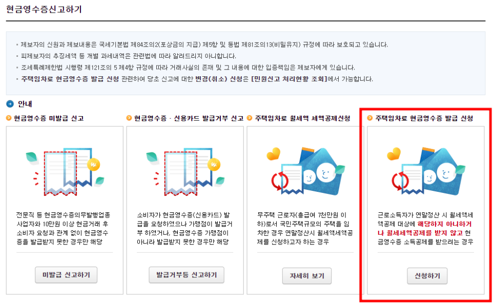 :국세청홈택스 --> 상담/제보 --> 주택임차료(월세) --> 주택임차료 현금영수증 발급 신청 --> 임차인, 임대인, 계약정보 입력 (임대차계약서, 월세이체 내역서)
