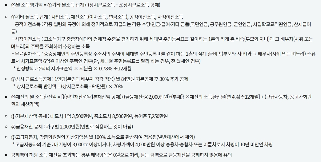 - 소득: 본인 및 배우자의 소득평가액과 자산의 소득환산액을 합산한 금액(소득인정액)이 선정기준 이하일것