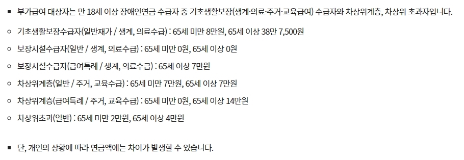 - 부가급여는 장애로 인해 추가로 드는 비용을 지원해 주기위한 급여로 추가 지출비용 보전 성격의 연금입니다. 장애로 인한 추가 지출비용 보전 성격이기애 부부감액과 초과분 감액이 적용되지 않습니다.