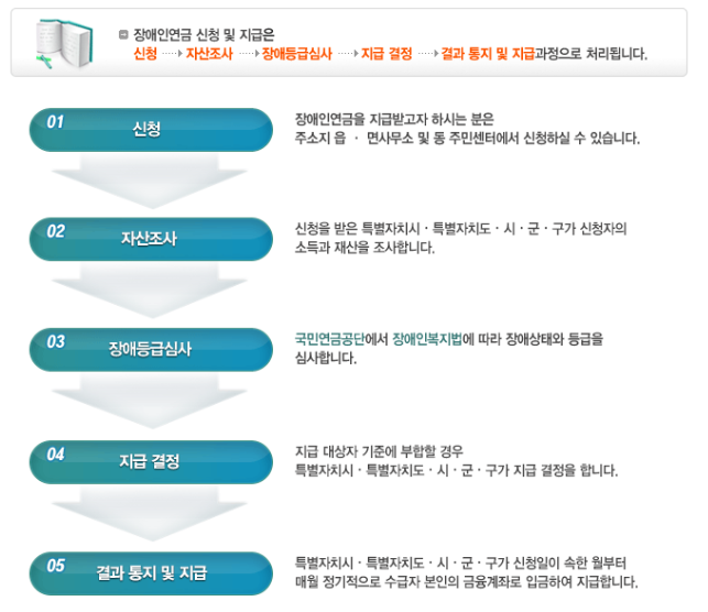 - 신청을 받으면 지자체에서 신청자의 소득과 재산을 조사하고, 국민연금공단에서는 장애상태와 등급을 심사하며 지급 대상자 기준에 부합여부를 결정합니다.