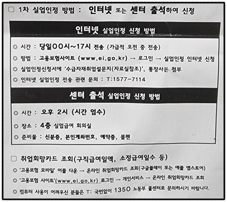 인터넷이나 센터 출석으로 1차 실업인정 신청 후 정해진 교육을 받아야 실업급여(구직급여)를 받을 수 있습니다.