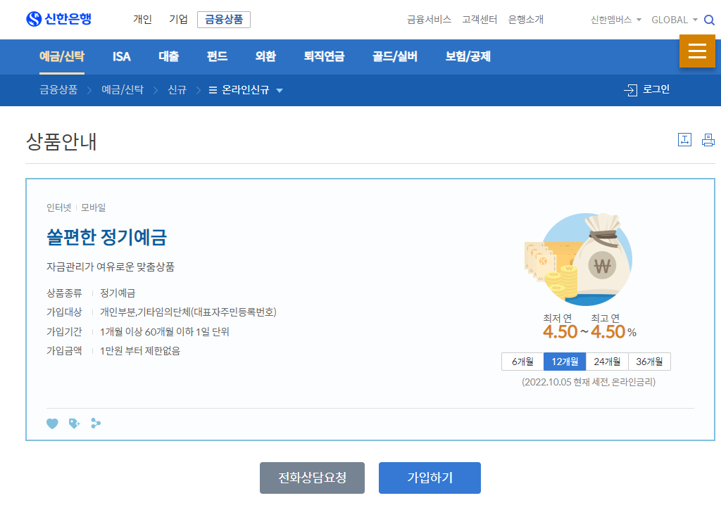 제1금융권인 신한은행 쏠편한 정기예금 상품의 금리가 1년 4.35% 에서 4.5%로 올랐습니다.
