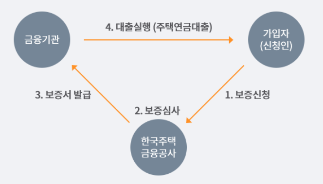 - 가입자가 주택금융공사에 보증신청 ---> 주택금융공사는 가입자의 주택에 대하여 보증심사 ---> 보증심사가 완료되면 은행(금융기관)에 보증서 발급 ---> 가입자는 은행에 주택연금대출을 신청하여 연금을 지급 받음