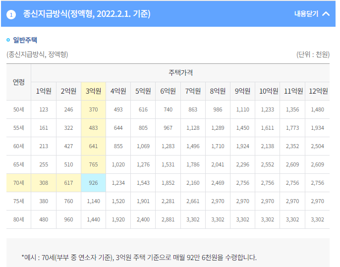- 70세, 3억 주택을 종신지급방식으로 주택연금 신청을 했을 경우 매월 92만 6천원 수령가능합니다.