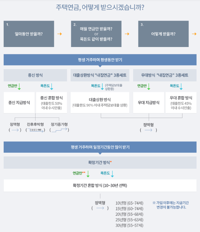 : 종신방식, 대출상환방식, 우대방식, 확정기간 방식 중 선택할 수 있습니다.. 아래 그림을 참고하시기 바랍니다.