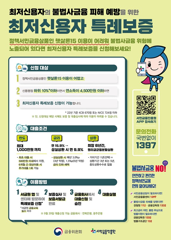 금융위원회·서민금융진흥원은 9월 29일 '최저신용자 특례보증' 정책서민금융상품을 출시하였습니다.