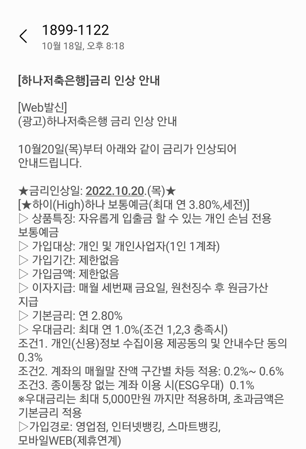 2022년 10월 20일 부터 하나저축은행 하이하나 보통예금 금리가 5천만원 까지 연 3.8% (우대금리포함) 입니다.