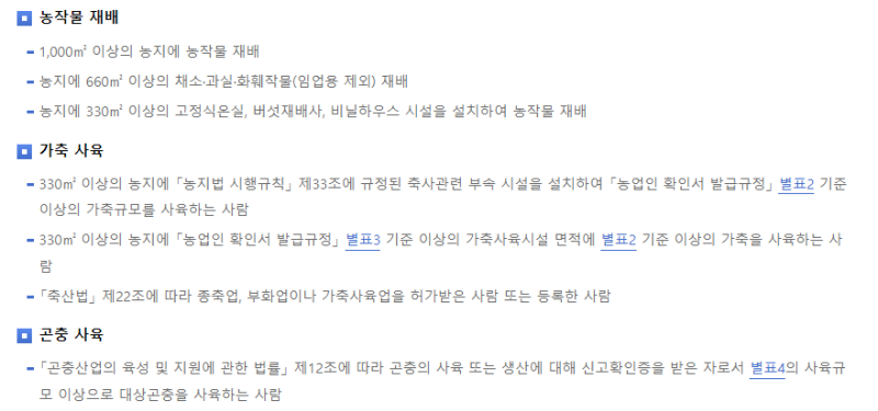 : 아래 '농작물재배', '가축사육', '곤충사육' 별 기술된 요건을 충족하면 신청한 재배품목·사육규모 등의 현장확인이 가능한 시점에 신청·등록이 가능합니다.