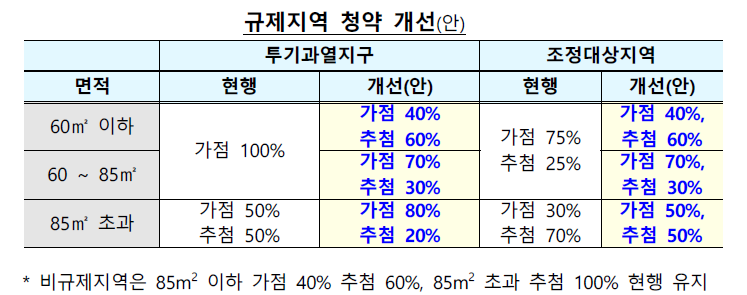 - 투기과열지구 내 1∼2인 청년 가구 수요가 높은 중소형 평형 (60㎡ 이하, 60㎡초과 ~85㎡ 이하)에 추첨제를 신설