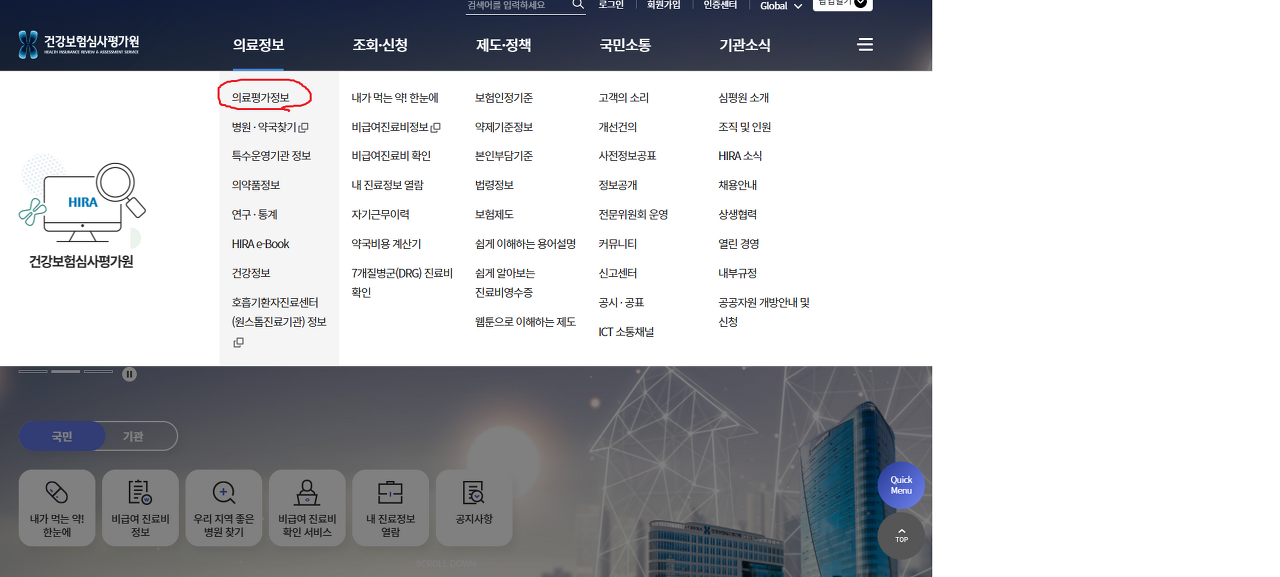 : 의료정보 > 의료평가정보 > 병원평가 검색 > 평가항목, 세부항목을 요양병원 선택 > 지역설정 > 병원등급 확인