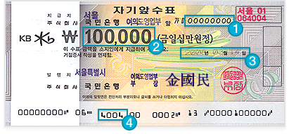 - 자기앞수표에는 일련변호, 발급은행, 지점번호, 수표의 권종 등을 나타내는 번호가 찍혀 있습니다.