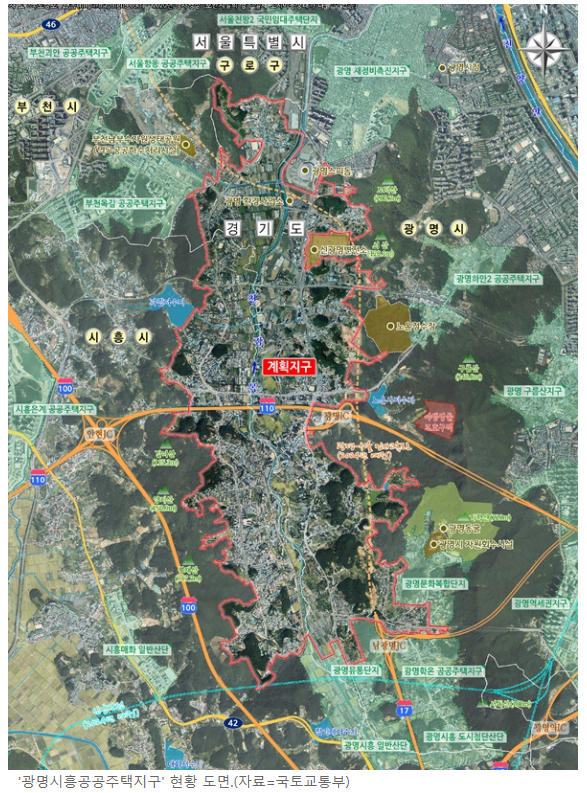 광명시흥 공공주택지구는 여의도부터 12km 거리에 위치한 광명시 광명동, 옥길동, 노온사동, 가학동과 시흥시 과림동, 무지내동, 금이동 일원 1271만㎡ 부지다. 여의도 면적의 4.3배 규모다. 정부는 7만가구를 지어 16만여명이 거주하는 미니신도시로 계획했다. 광명과 시흥이 함께 준비해 두 개의 핵심을 가진 ‘듀얼허브시티’(Dual Hub City)라는 개발방향으로 일자리, 교육, 문화 등 기반시설을 조성하기로 했다.