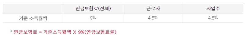 - 본인과 사업장의 사용자가 각각 절반씩, 즉 4.5%씩 부담합니다.